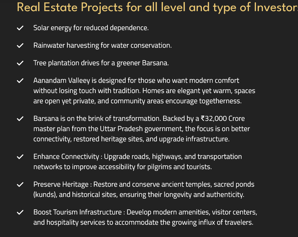 Aanandam Valley is a planned township located in Barsana, Mathura, Uttar Pradesh. It’s deeply inspired by the spiritual heritage of Braj (the land of Radha and Krishna).
